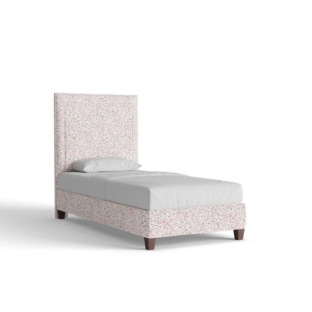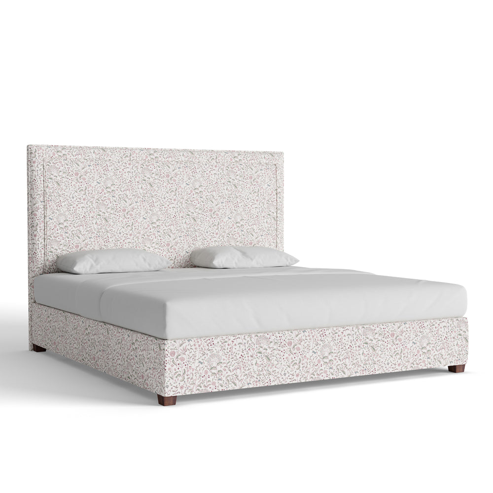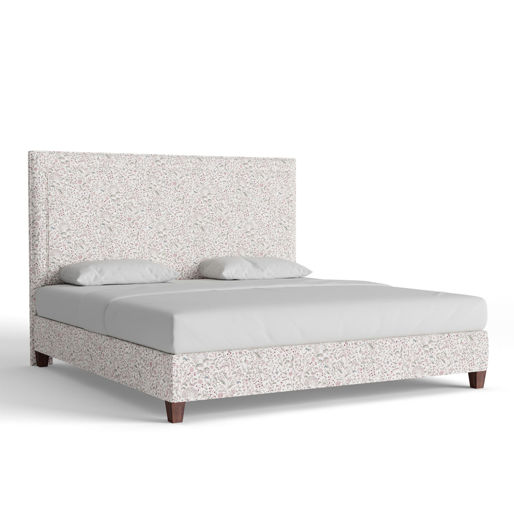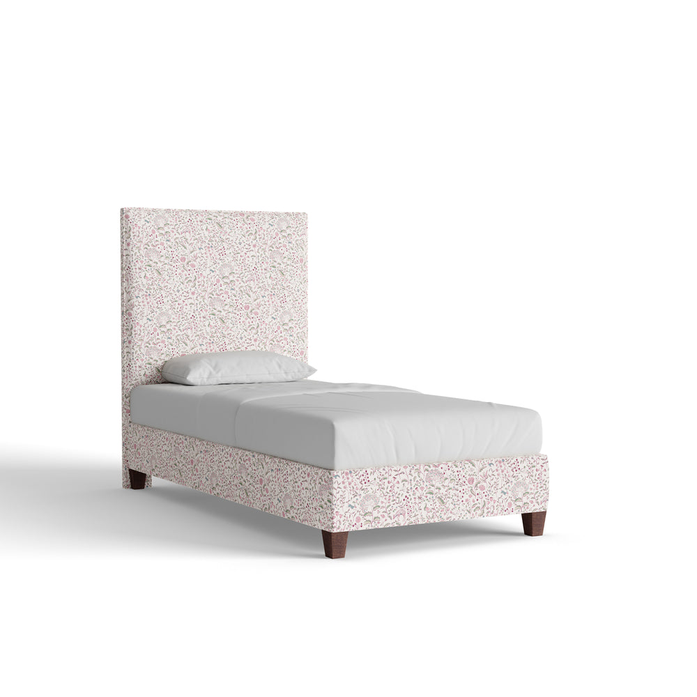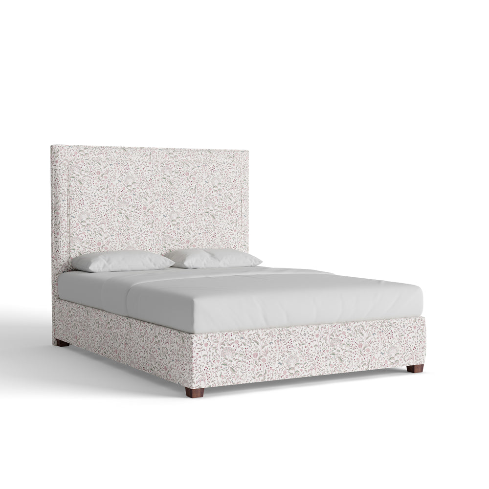 The Delaney Bed features a mid-rise silhouette with clean lines and quiet structure. Shown here in our Ruby Burgundy printed linen fabric, the whimsical pattern adds charm to the otherwise simple shape. Details matter—choose your size, welt, and base to make it your own.