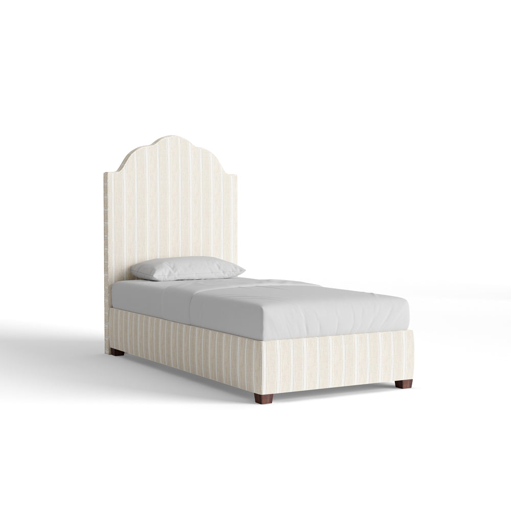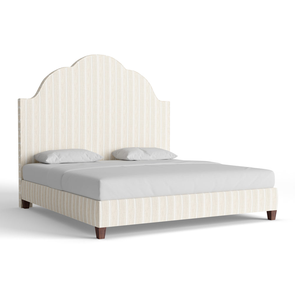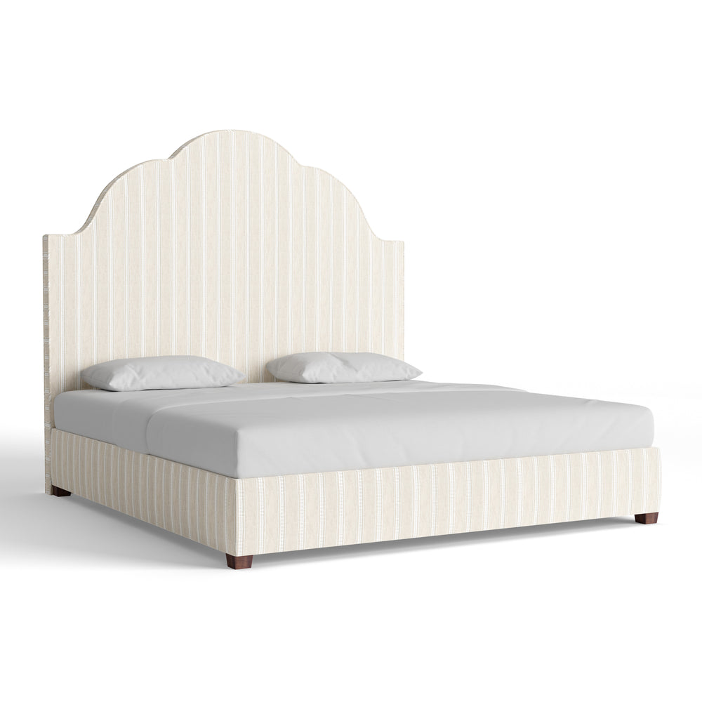Traditional, with a twist. The Regina Bed features an arched silhouette defined by graceful curves and a tailored finish. Shown here in our Margot Flour embroidered fabric, its delicate pattern and elegant shape give the piece a quietly sophisticated feel. Details matter—choose your size, welt, and base to make it your own.