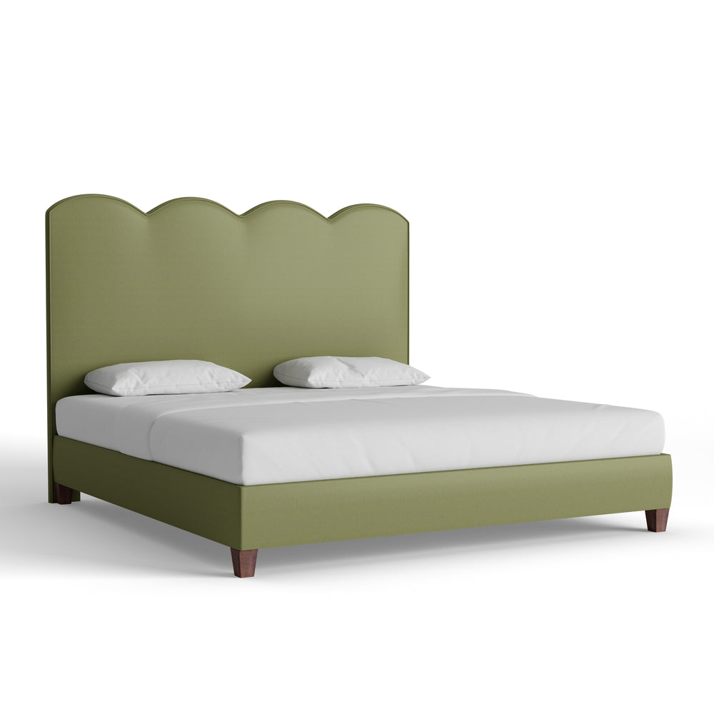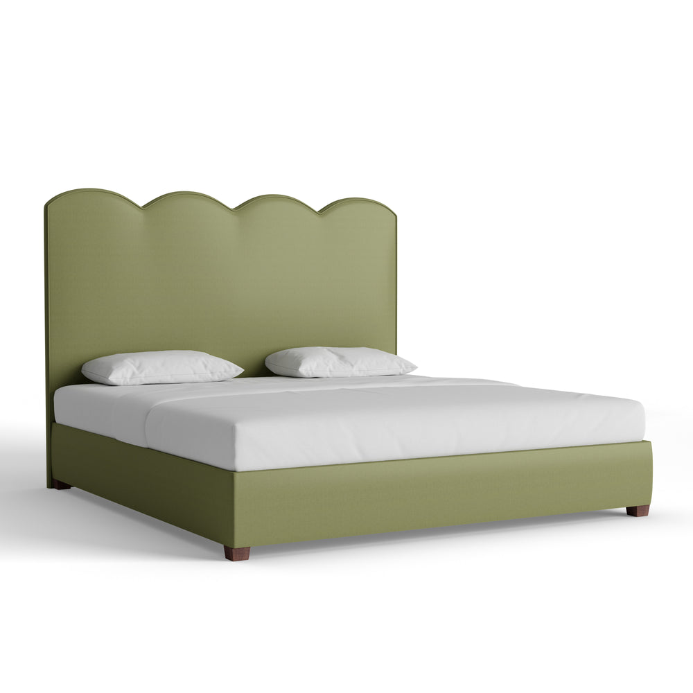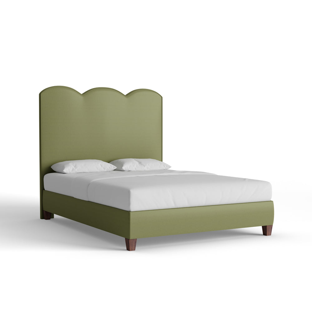 The Theodora Bed features a scalloped silhouette that strikes the perfect balance between whimsy and sophistication. Shown here in our Moss linen fabric, it adds personality to any space with its charming shape and fresh pop of color. Details matter—choose your size, welt, and base to make it your own.