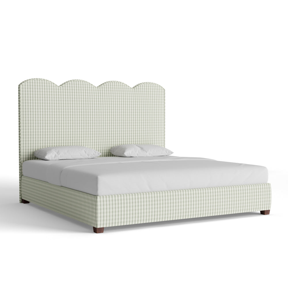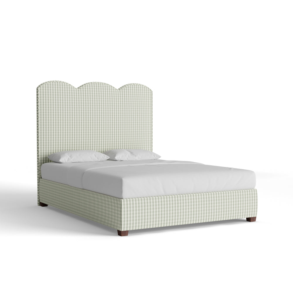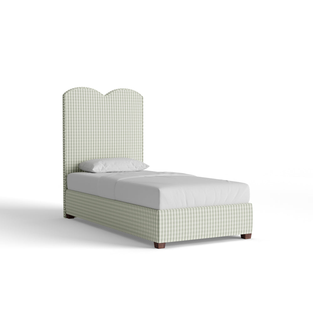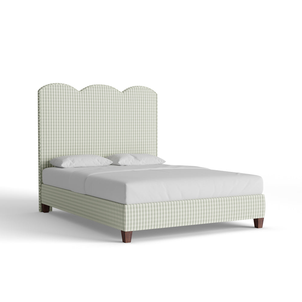 The Theodora Bed features a scalloped silhouette that strikes the perfect balance between whimsy and sophistication. Shown here in our Millie Sage woven fabric, the classic pattern and standout shape pair effortlessly to create a piece that feels timeless yet unique. Details matter—choose your size, welt, and base to make it your own.