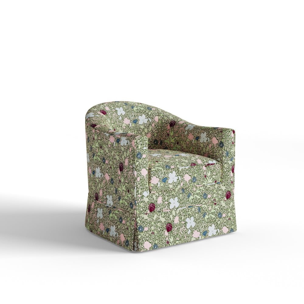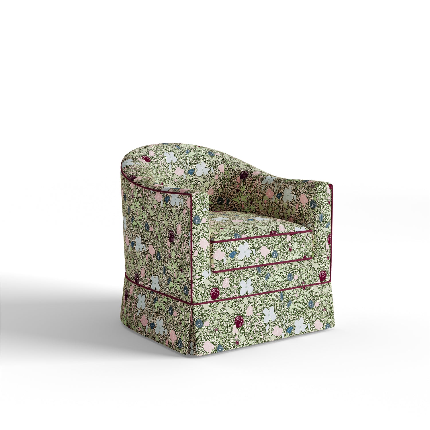 Graceful lines meet timeless appeal. The Adeline Chair features a curved silhouette that blends comfort with effortless sophistication. Shown here in our Matilda printed linen fabric, it’s a statement piece that anchors the room with rich color and bold pattern. Details matter—choose your welt and base to make it your own.