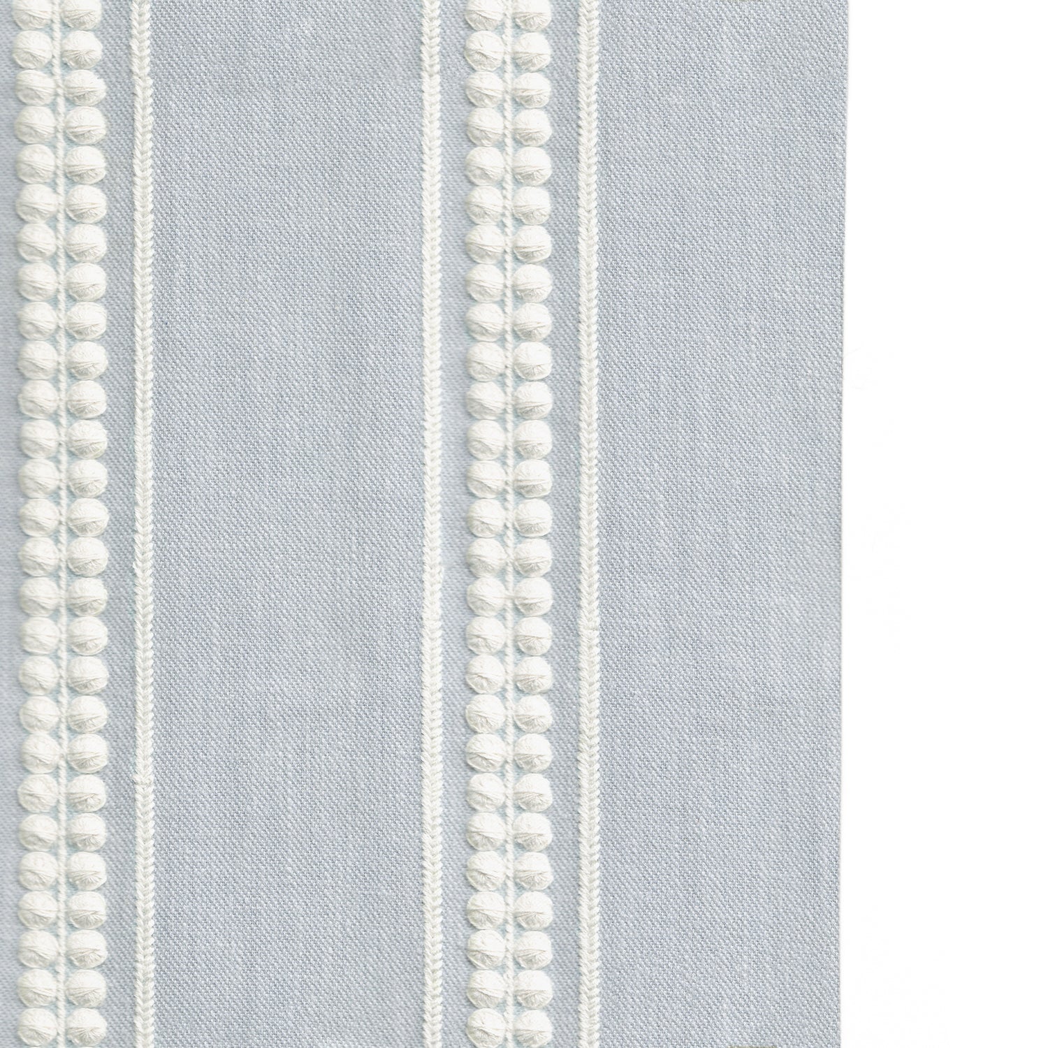 Margot Mist offers a fresh take on the classic stripe, featuring intricate white embroidery against a soft blue ground. The delicate stitched details add texture and depth, while the airy color palette evokes a refined coastal elegance—perfect for bringing a serene charm to any space.