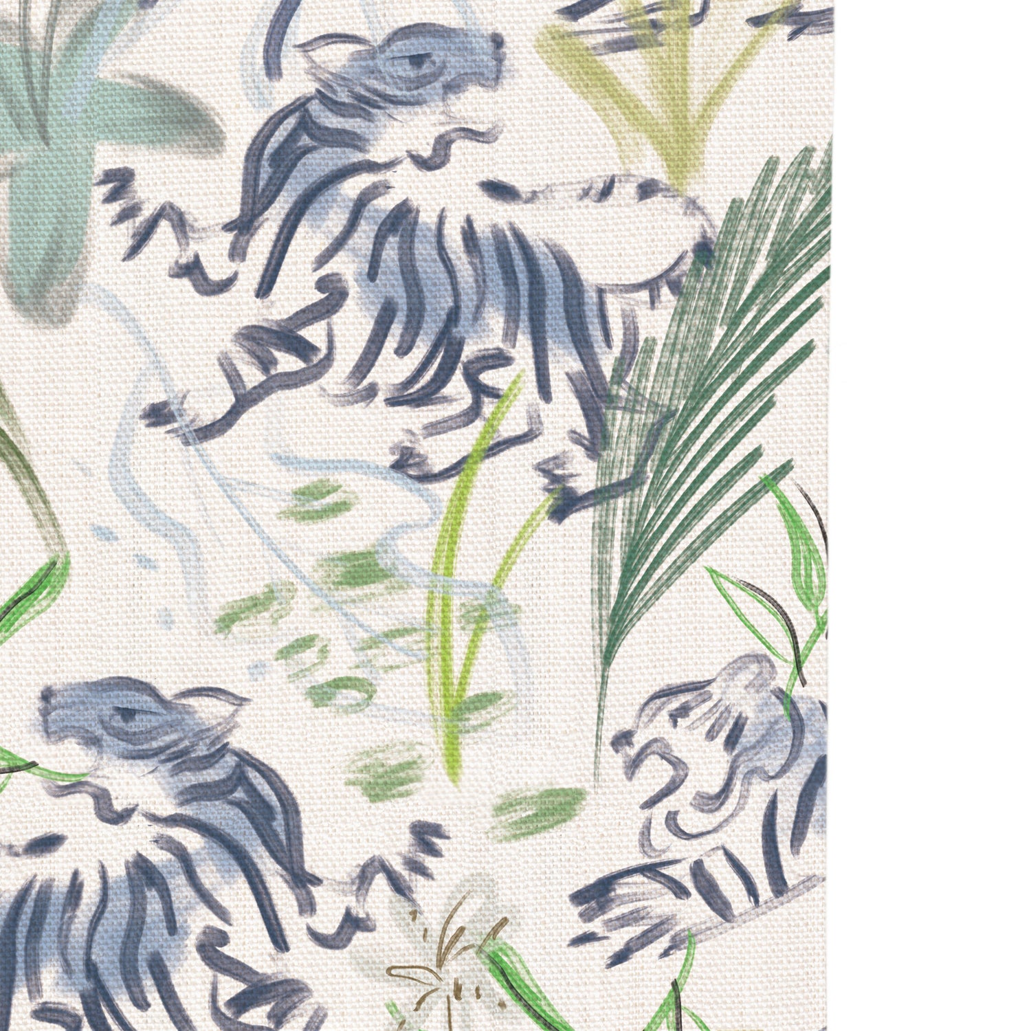 Frida Green comes to life in a palette of cool blues and lush greens, where playful tigers roam through a painterly landscape of fronds and florals. Inspired by the vibrant wallpaper that adorned Kelsey’s childhood home, this intricate design is rich with movement, depth, and timeless charm.