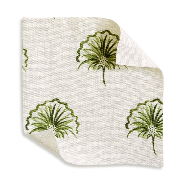 Penelope Moss is a refined drop repeat pattern featuring delicate, scalloped floral motifs on a natural linen ground. With its organic lines and soft green palette, this design feels both timeless and effortlessly fresh.