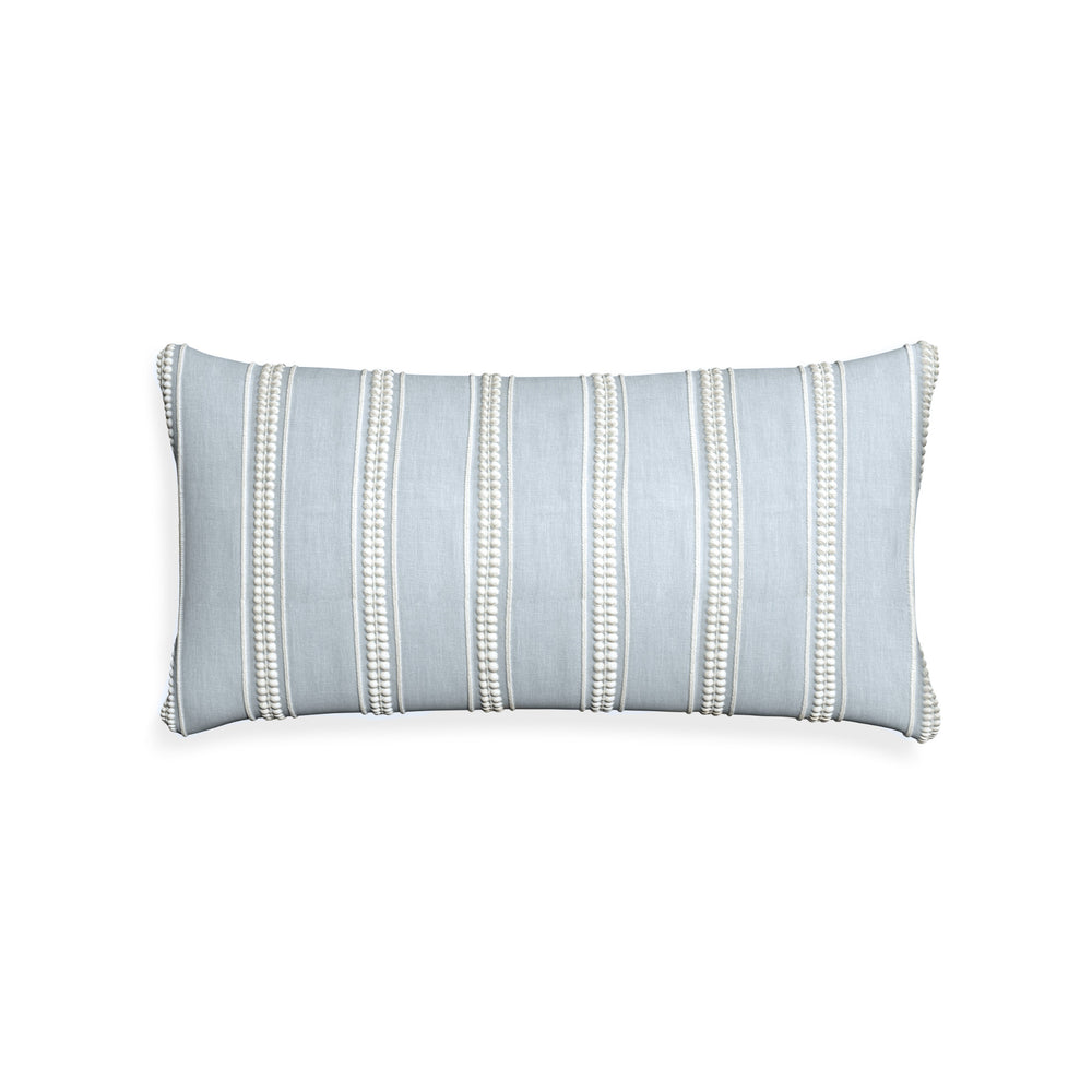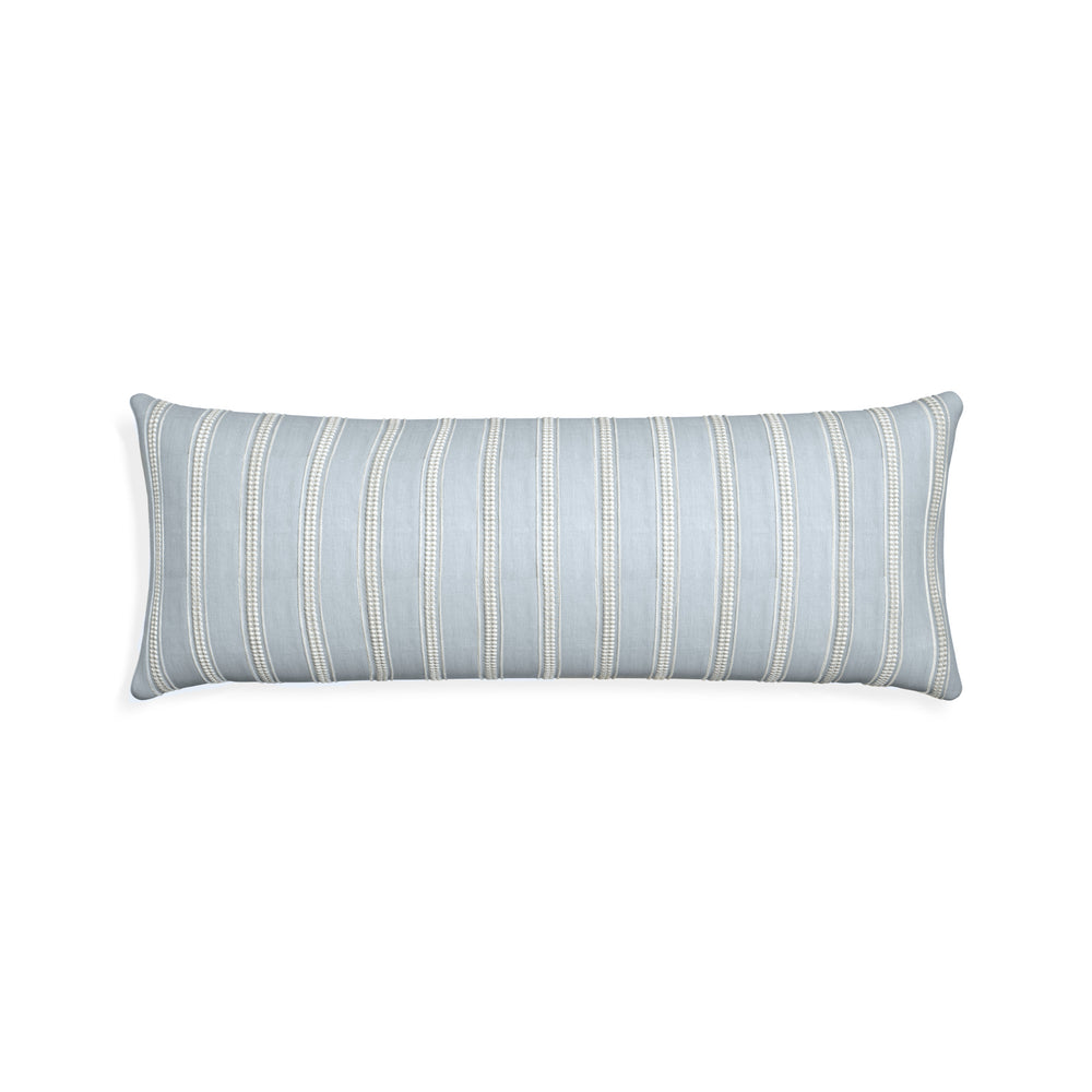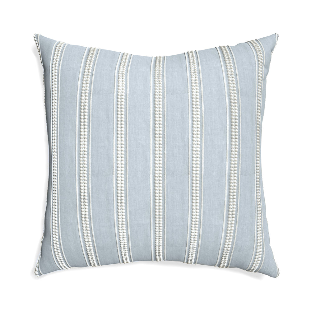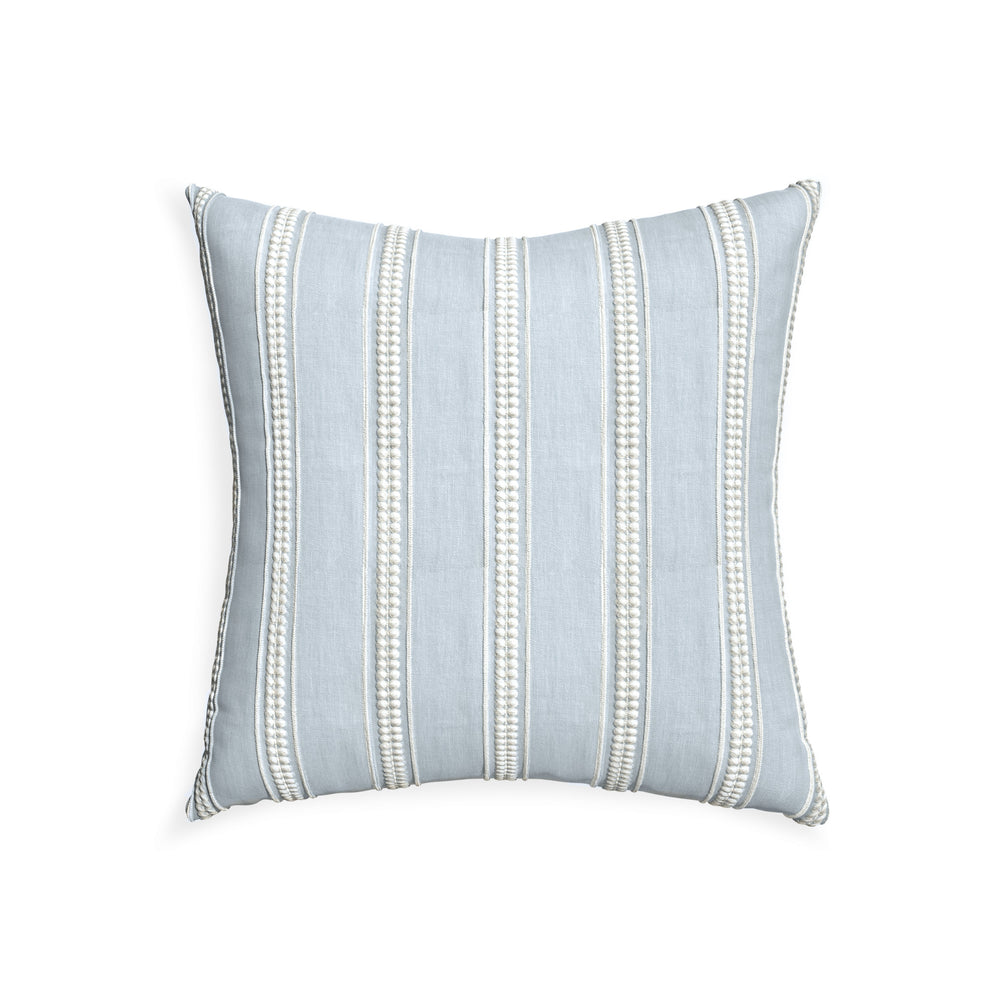 Margot Mist offers a fresh take on the classic stripe, featuring intricate white embroidery against a soft blue ground. The delicate stitched details add texture and depth, while the airy color palette evokes a refined coastal elegance—perfect for bringing a serene charm to any space.